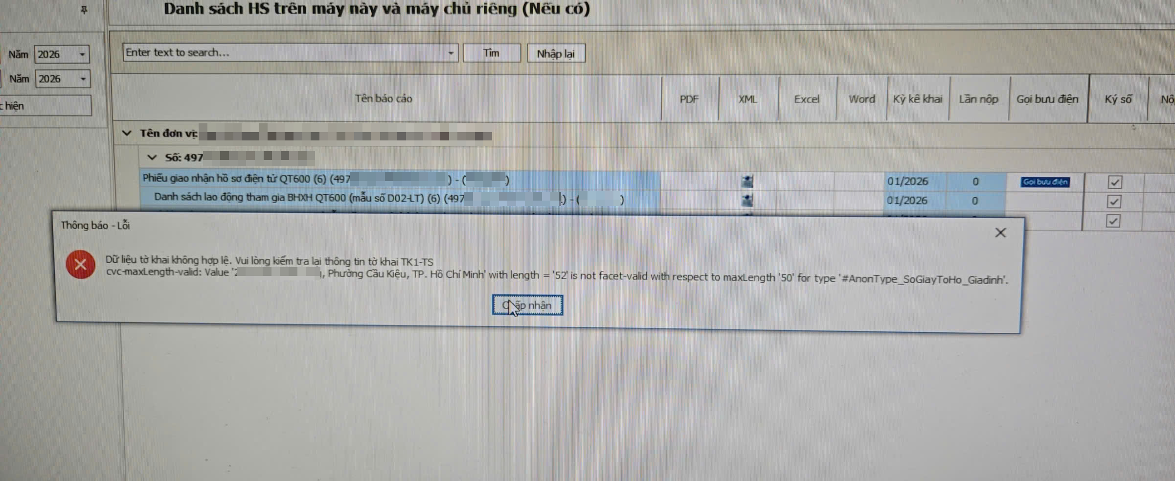 Thông báo này xuất hiện khi ký nộp HS, là do số ký tự nhập ở ô số giấy tờ trong phần PL Hộ gia đình bị quá số ký tự cho phép (chỉ 50 ký tự). Chỉ cần chỉnh lại hoặc viết tắt một số từ để rút ngắn số lượng ký tự lại là được.